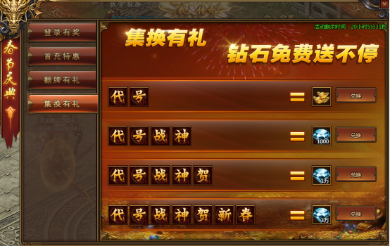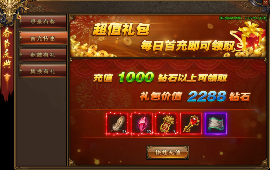 活动说明:活动期间,每日充值1000钻石以上,可领取价值2288钻石的超值礼包!