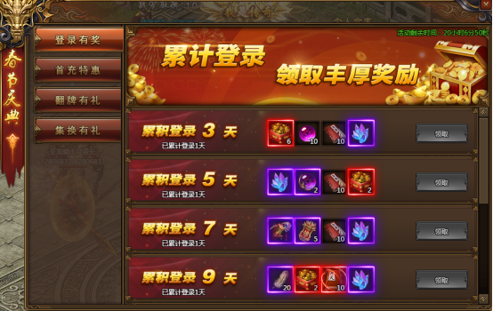活动说明:活动期间,累计登陆达到对应天数,可领取对应奖励!